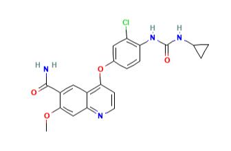 乐伐替尼是一种受体酪氨酸激酶 (RTK) 抑制剂,可抑制血管内皮生长因子 (VEGF) 受体 VEGFR1 (FLT1)、VEGFR2 (KDR) 和 VEGFR3 (FLT4) 的激酶活性。除了正常细胞功能外,乐伐替尼还抑制其他与致病性血管生成、肿瘤生长和癌症进展有关的 RTK,包括成纤维细胞生长因子 (FGF) 受体 FGFR1、2、3 和 4;血小板衍生生长因子受体α (PDGFRα)、KIT 和 RET。