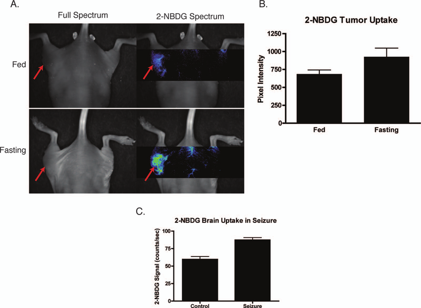Assessment of 2-NBDG as a marker of glucose metabolism in animals. a Multispectral fluorescence imaging of HT-29 subcutaneous tumors in nude mice 40 min following administration of 500 nmol of 2-NBDG in fed versus fasting states. Red arrows indicate the location of the tumor. There is a noticeable increase in 2-NBDG signal after the animal was kept NPO for 24 h. b Analysis of n =4 animals with subcutaneous tumors imaged, while fed and fasting shows a statistically significant p 0.05 increase in 2-NBDG uptake in fasting animals. c Statistically significant p 0.05 increase in 2-NBDG signal in the brain of an animal experiencing generalized seizures induced by injection of pilocarpine i.p. versus control. These data suggest that 2-NBDG localization reflects true glucose utilization rather than nonspecific extravasation.