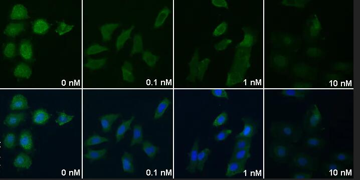 Anti-Bcl-2 antibody 通过 ICC/IF 对用Fulvestrant处理的 MCF7 细胞中的 BCL2 进行染色。 如文献中所述,BCL2 表达的降低与Fulvestrant浓度的增加相关。